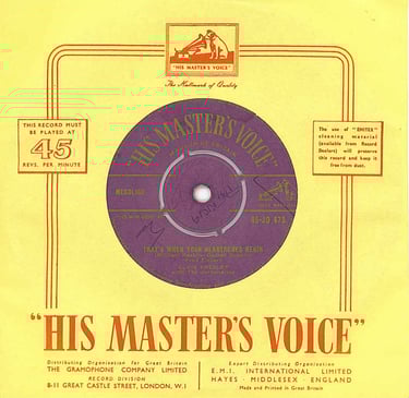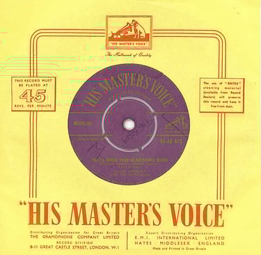 This 45 was released in the UK under the His Master's Voice label, catalogue No. Pop 359, it would enter the chart on June 20th 1957 and would reach the number 6 slot on the chart, it had a purple label with gold lettering and later pressings with silver lettering.